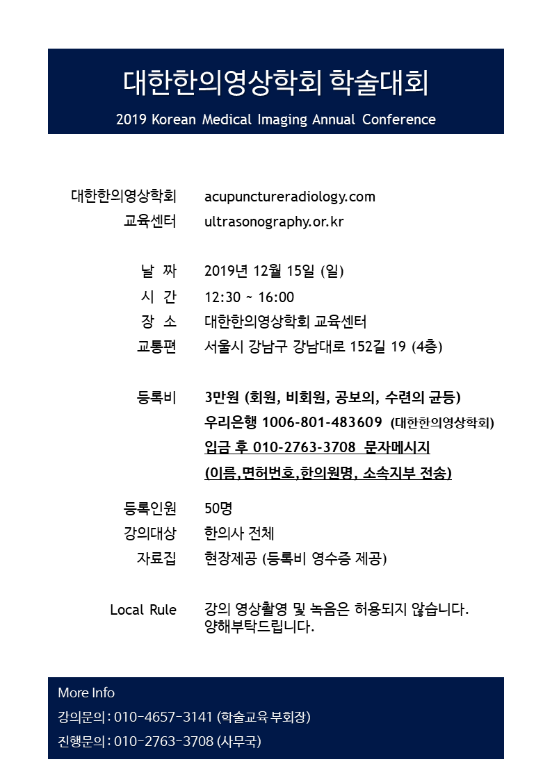 | [2019.04.14] 대한한의영상학회 2019 춘계 학술대회 (0) | 2019.03.28 |