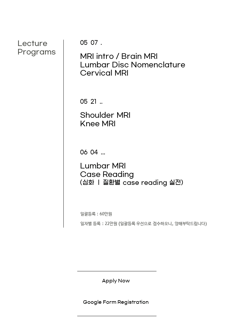 | 영상의학 입문을 위한 Basic Spine MRI [ 2023.01.14 ] (0) | 2022.12.22 |