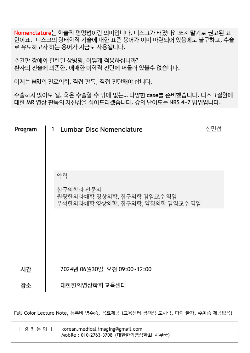 | 2025 근골격계 약침의학 + 근골격계 MRI [ Lecture Series 마감] (2) | 2024.12.13 |